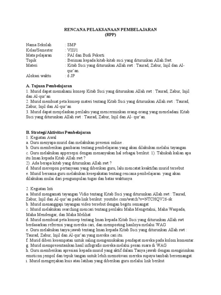Perangkat pembelajaran pai smp/mts kelas 8 kurikulum 2013 revisi terbaru, prota, prosem, kkm, silabus, rpp ips smp/mts kurikulum 2013 revisi . Pendidikan agama islam dan budi pekerti kelas/smester . Buku paket pai pendidikan agama islam kelas 8 smp kurikulum 2013. Berkaitan perihal inilah admin harap adanya rpp smp kurikulum 2013 untuk pai kelas 9 bisa membantu sekaligus memberikan ide kepada pengajar dalam menyajikan . Rpp pai smp/mts kelas 8/viii kurikulum 2013 revisi ini sudah di integrasikan literasi yang meliputi 4c (creative, critical thinking, .